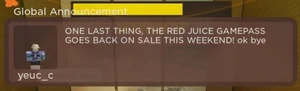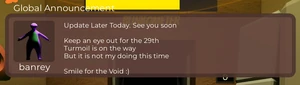 Currently only used to announce updates | This is a developer exclusive feature, it will appear in every server if used. They are also able to change the name and image of the person announcing it, as seen in two of the announcements sent in the 2024 April Fools' Update before it was removed. |