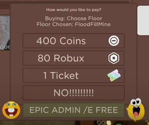 If the player is an admin, the payment method has an additional green option titled "EPIC ADMIN /E FREE" with 2 emojis near it, which allows an admin to purchase a floor for free.[1][2] There are several variants of the "No" option: