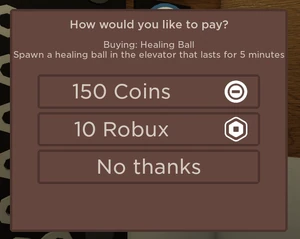 In-game purchase menu | The player can choose to pay with coins or Robux when purchasing a healing squishy or knifed voomba (top image), or a floor ticket when purchasing floors in the floor selector menu (bottom image).