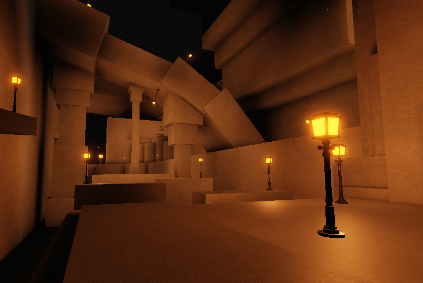 The floor takes place in a cavern-like area, with lantern posts located throughout the floor alongside the course. Facing the elevator, there can be seen an obstacle course which can randomize for every time the floor is chosen, alongside what seems to be water below.