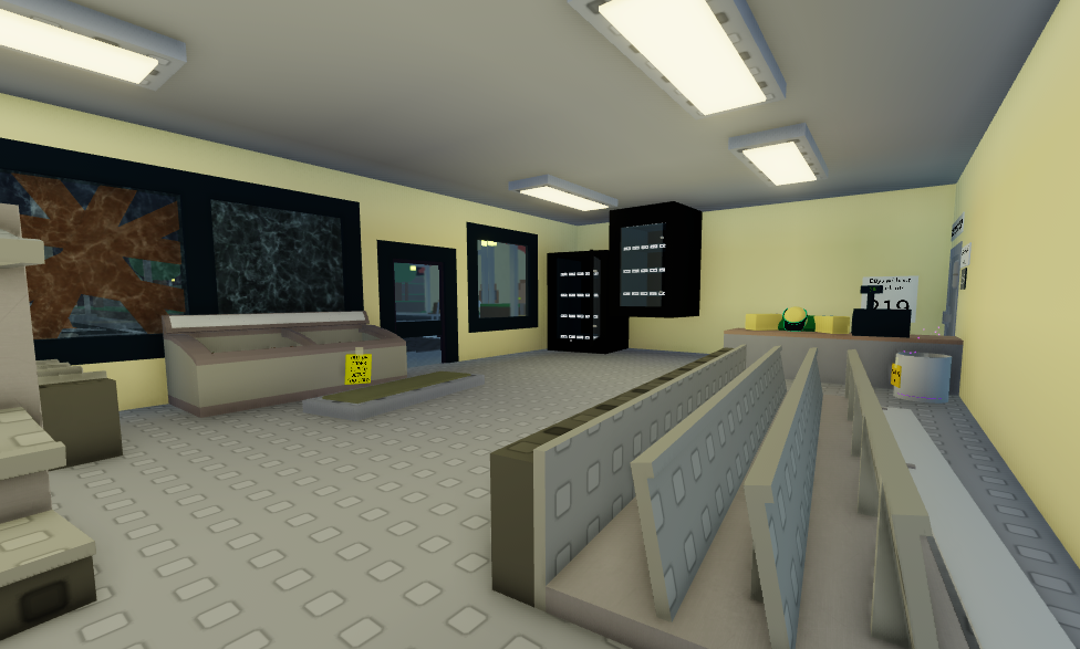 There are also some windows that appear to be broken, with one boarded up, as well as two empty vending machines, one being tipped-over, alongside a empty shelf that has been tipped over. Players can also see some notes that are placed on the left shelf, and the freezer. In the freezer, there can be seen several tubs of ice cream.