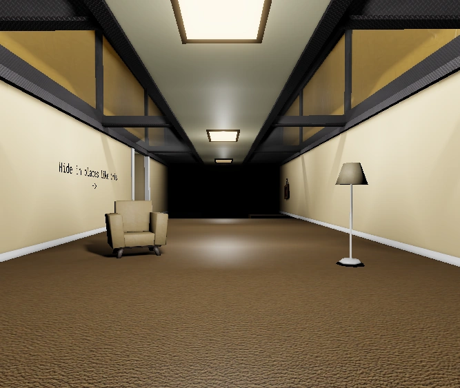 The floor takes place in a liminal beige-painted hallway that consists of several furniture (e.g. sofas and lamps), alongside several obstacles that players must pass through, such as parkour segments or long, thin walkways suspended over void. There are also numerous paintings which reference various aspects of the game, amongst other media.